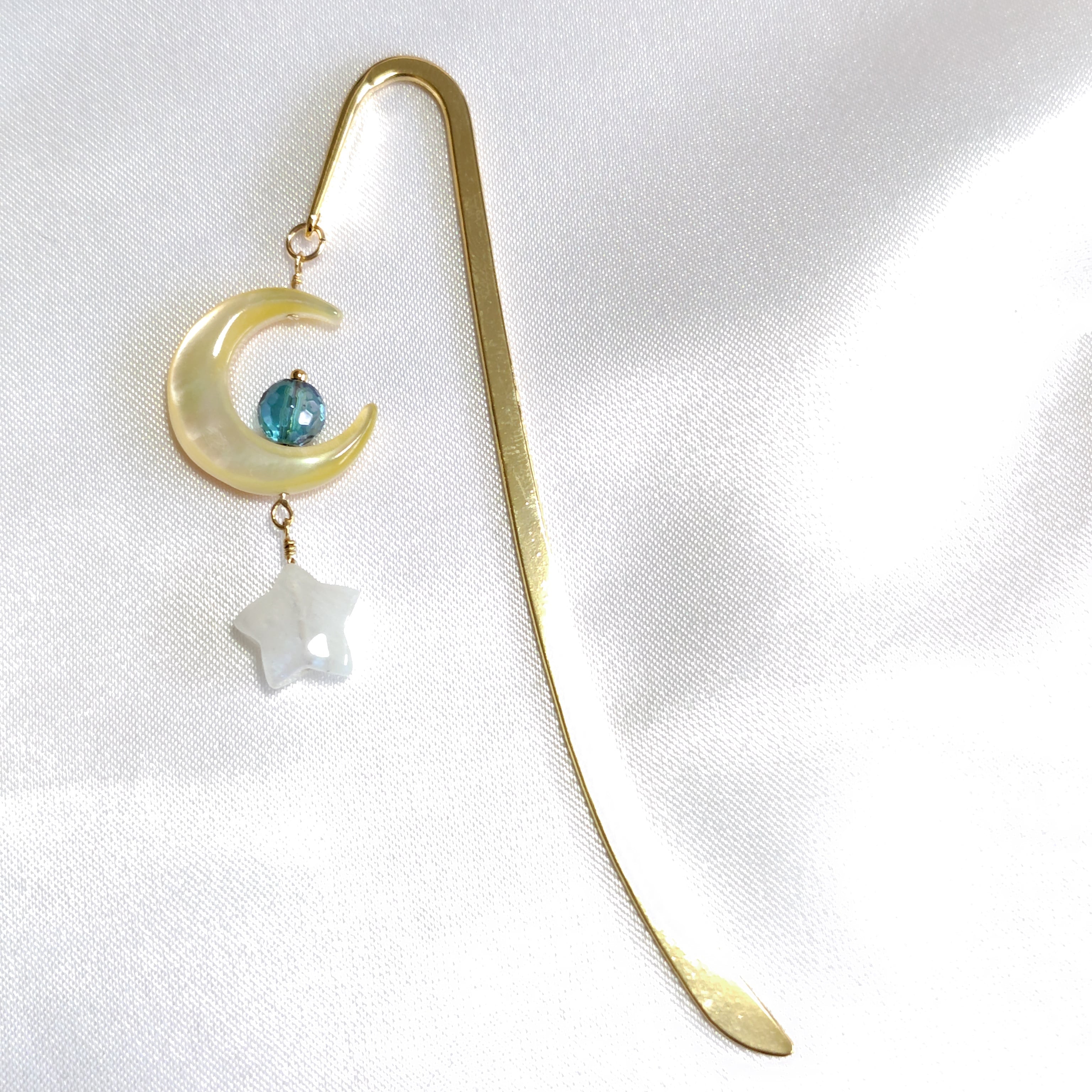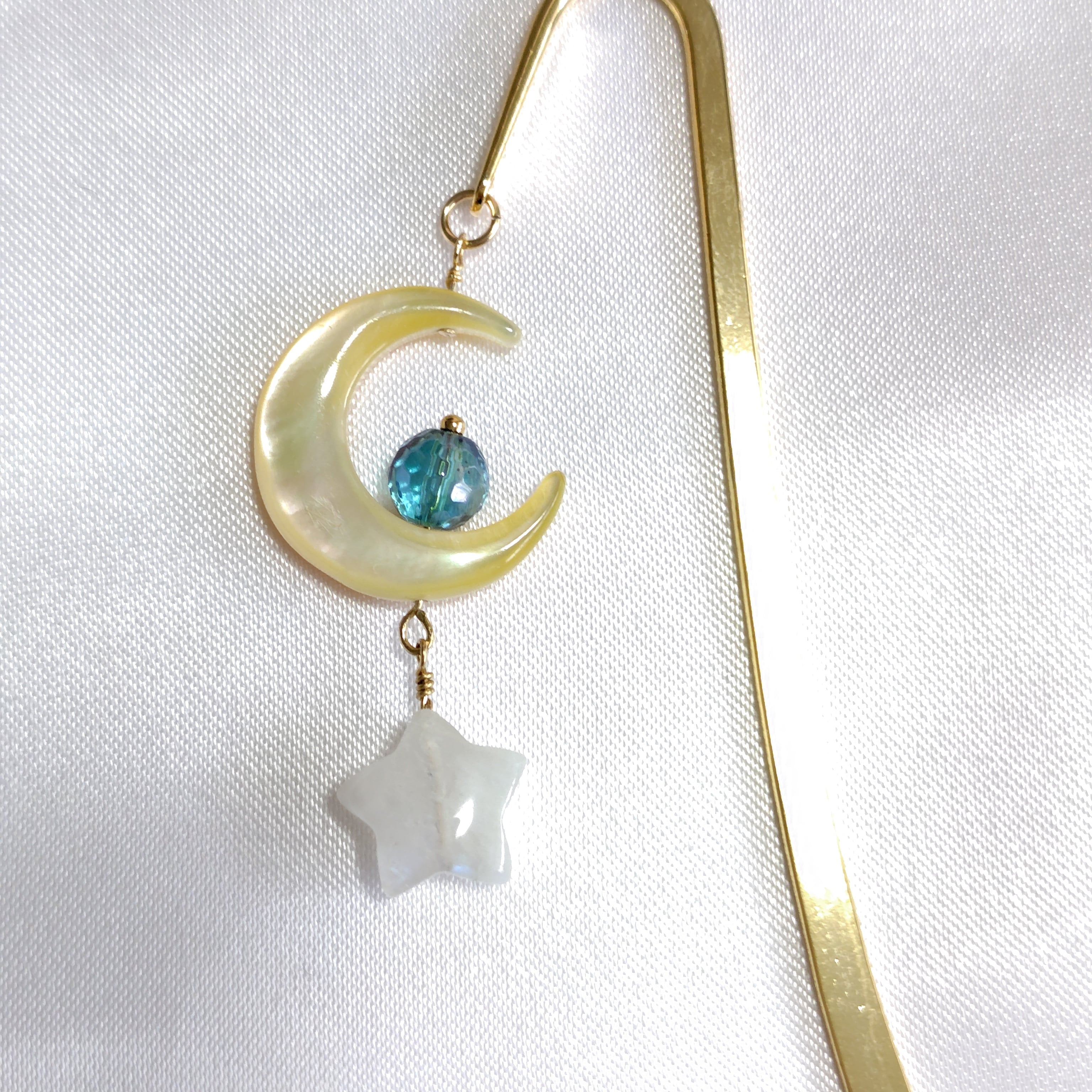 シェルのお月様にブルーのアクアオーラ(虹色の加工をした天然石)、その下にムーンストーンのお星様が揺れるブックマーカーです。