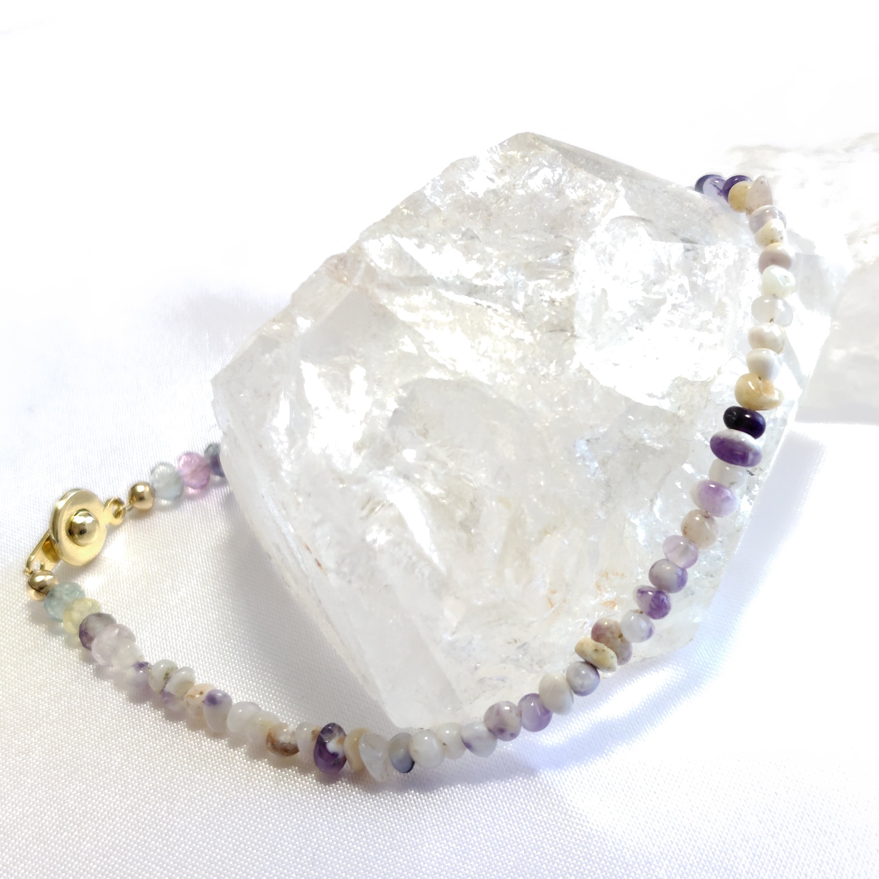 ティファニーストーンはフローライトの化石と言われることもありますが、フローライトだけでなくカルセドニーやオパール、ロードナイトなど様々な石を含む希少な混合石です。化石というワードから端にフローライトを合わせて進化の過程を表してみました。