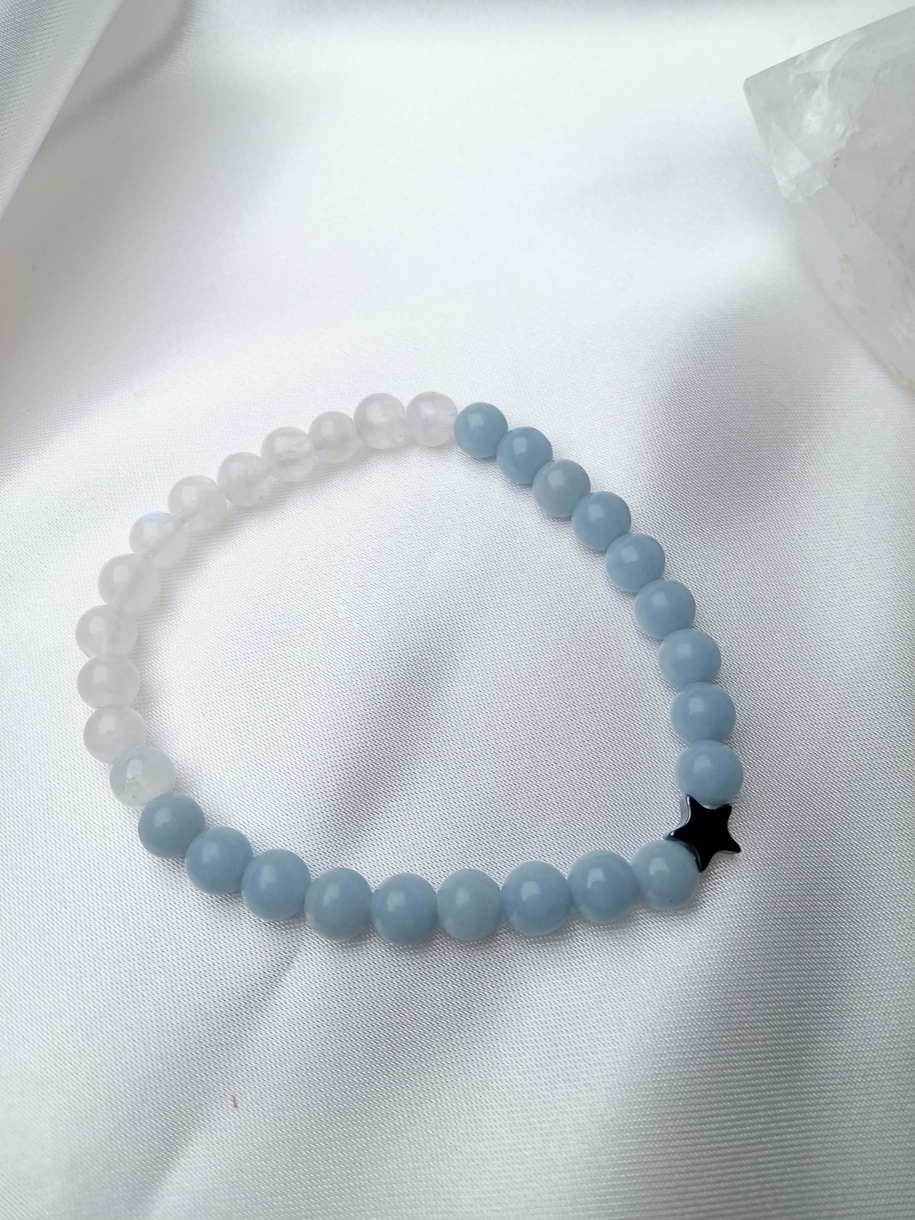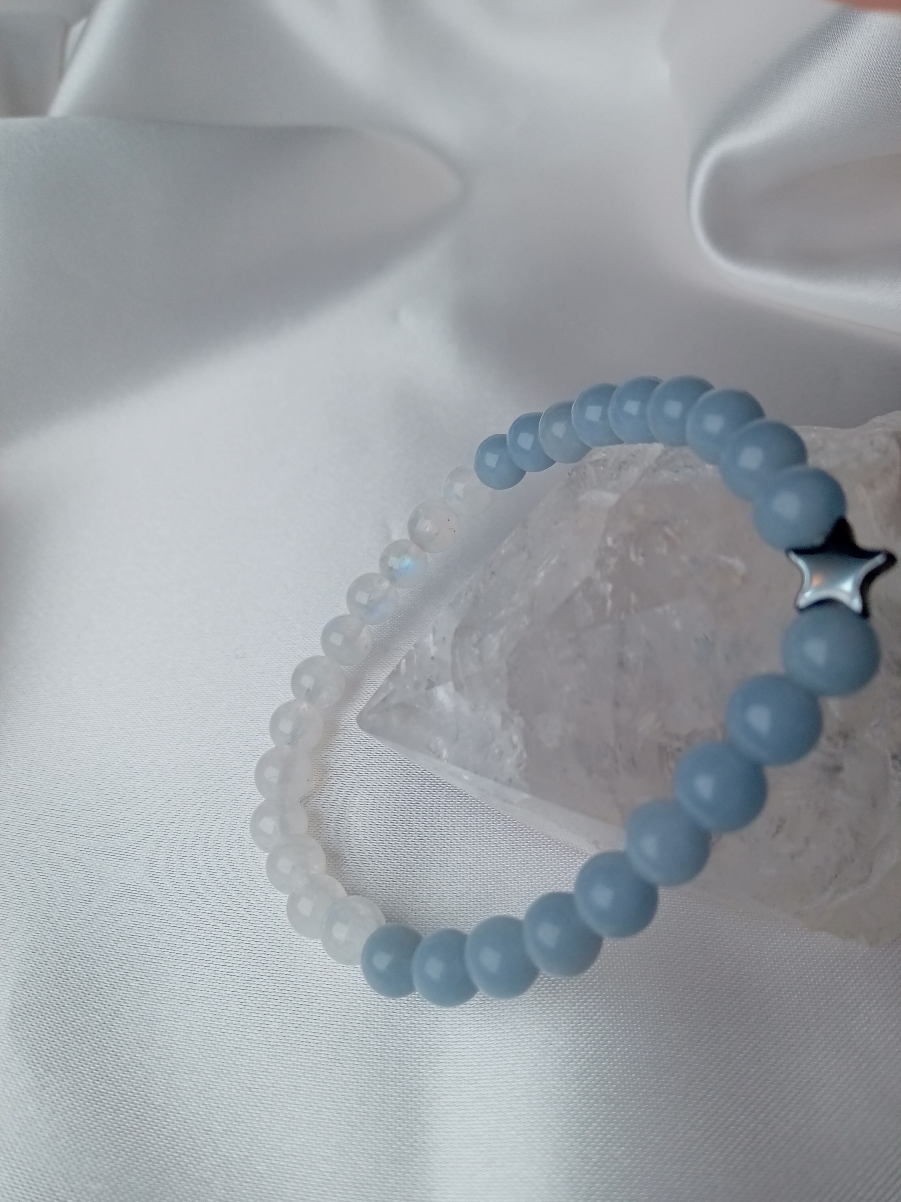 エンジェライトはその名の通り天使の石。天使が優しく見守ってくれるでしょう。ムーンストーンは情緒を安定させてくれるお守りに。