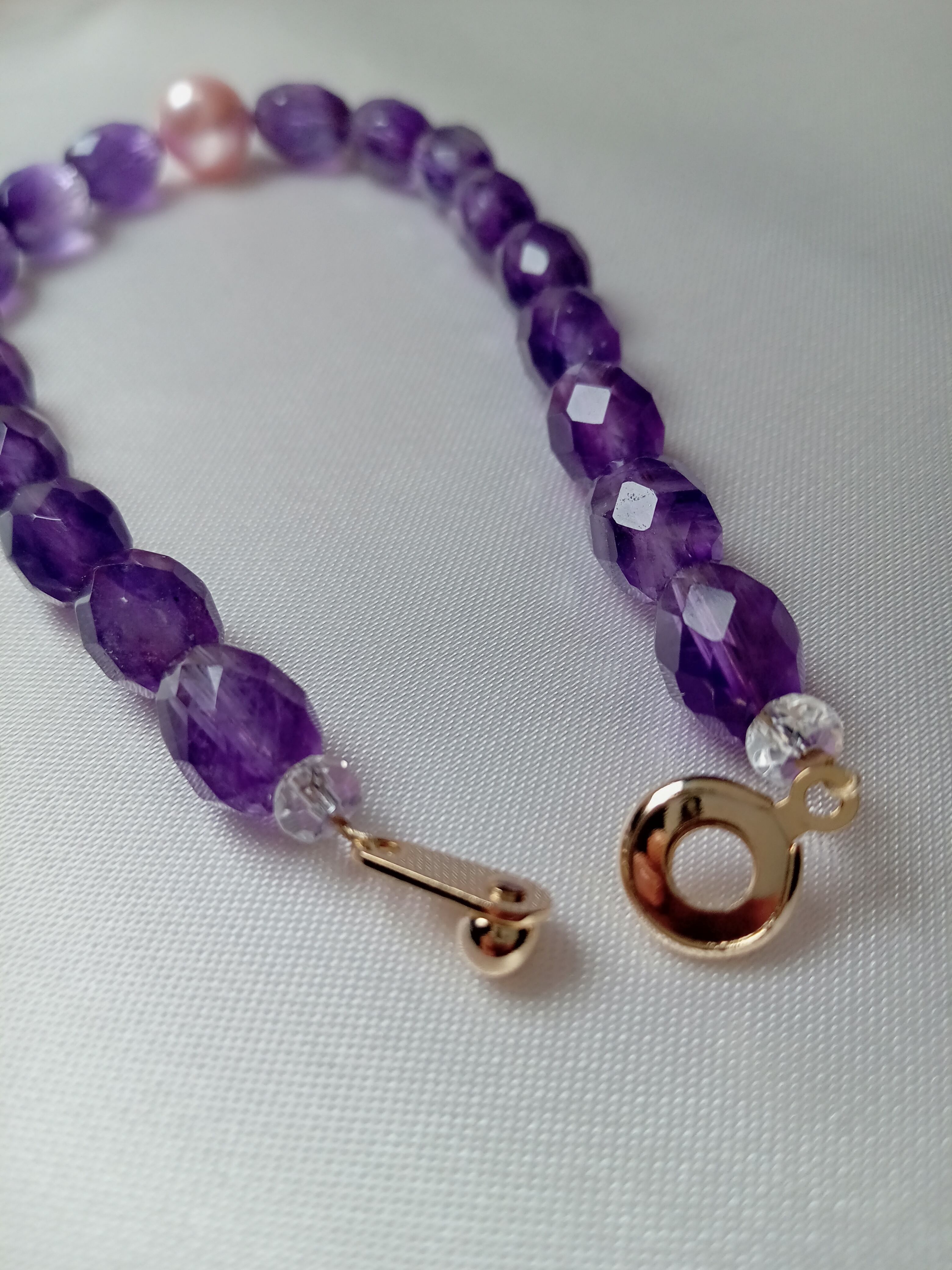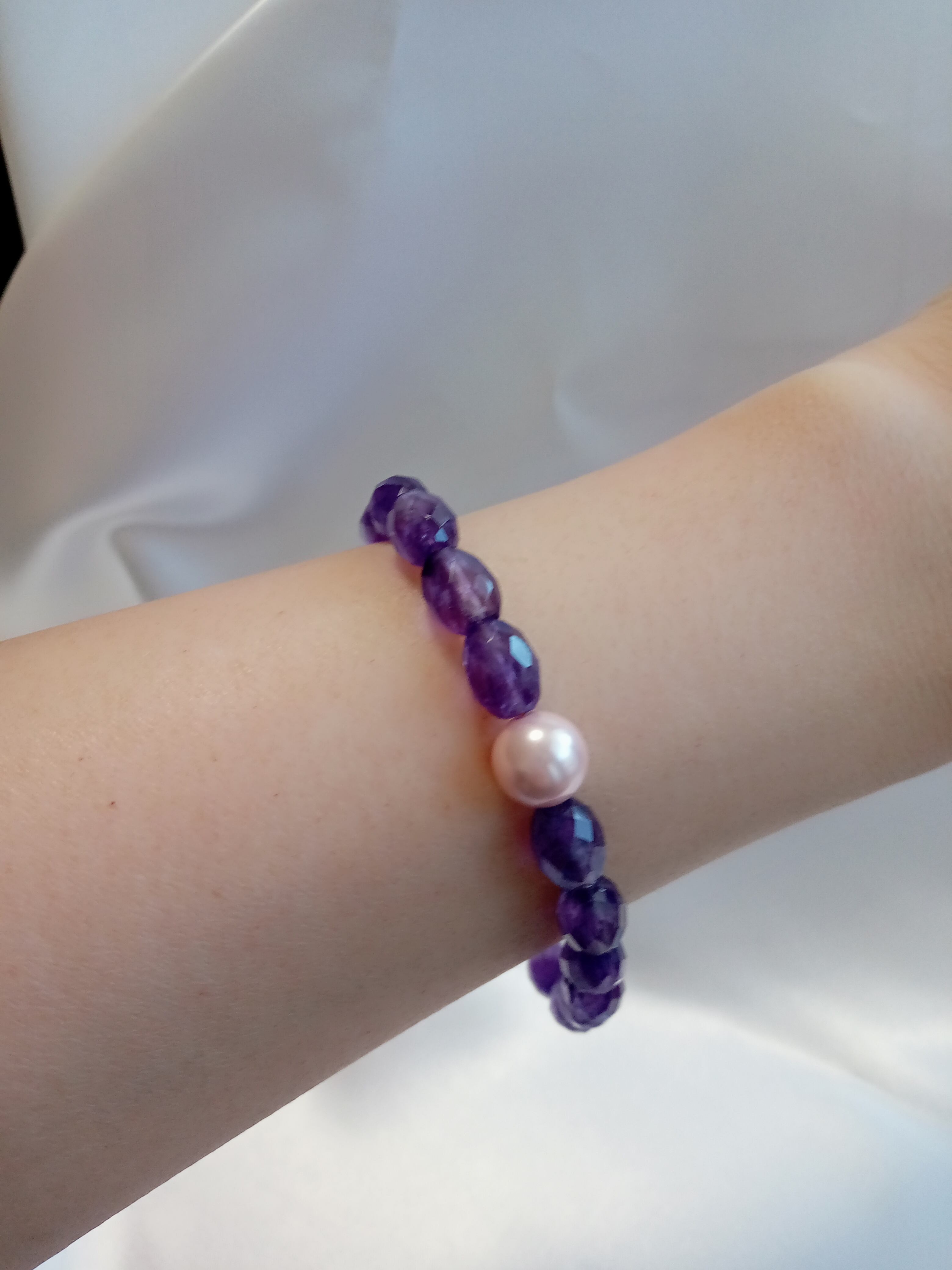 天然石アメジストとピンク色のシェルパールのブレスレット