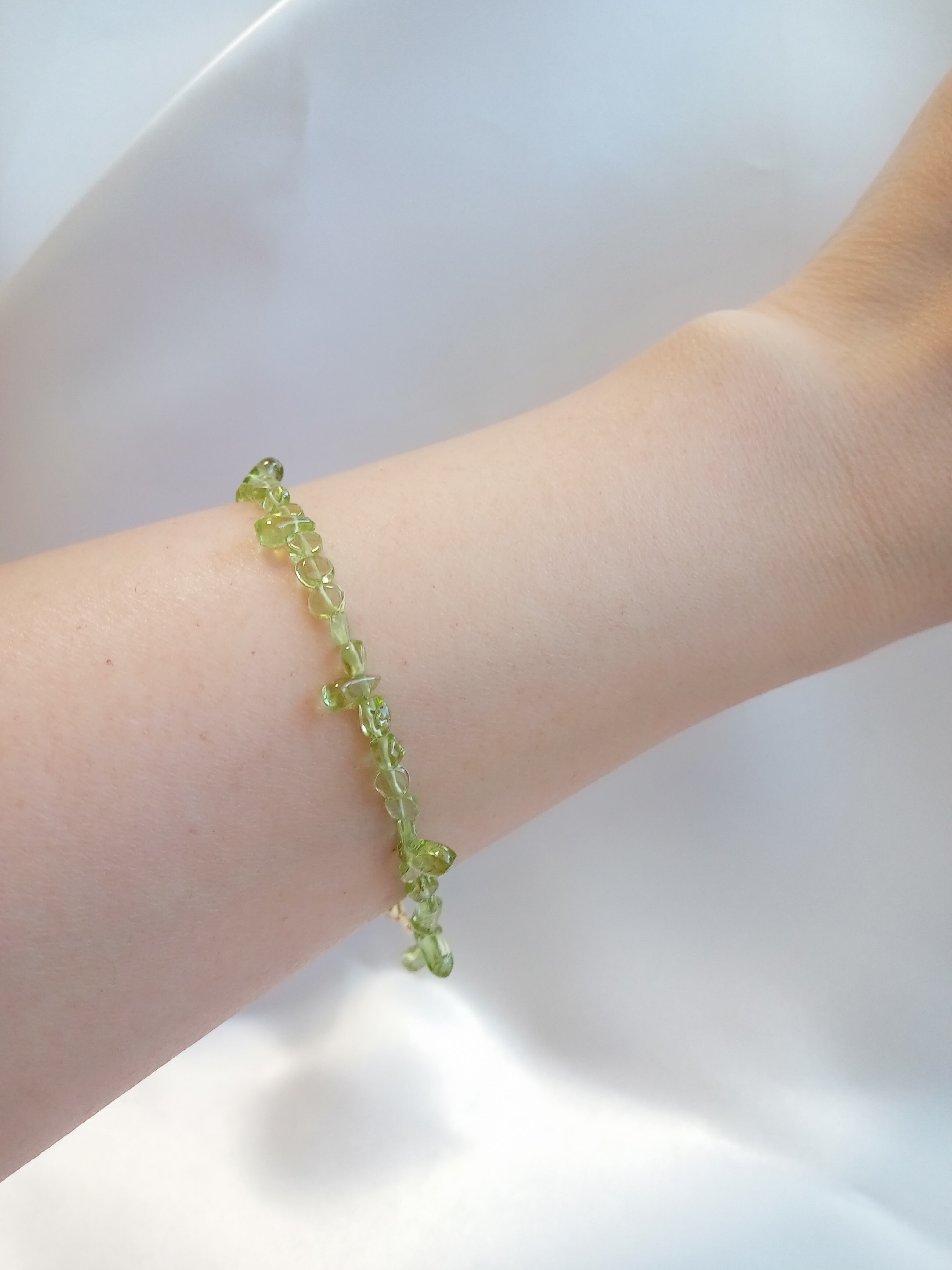天然石はペリドットのみでお作りしました。重ね付けにもおすすめです。