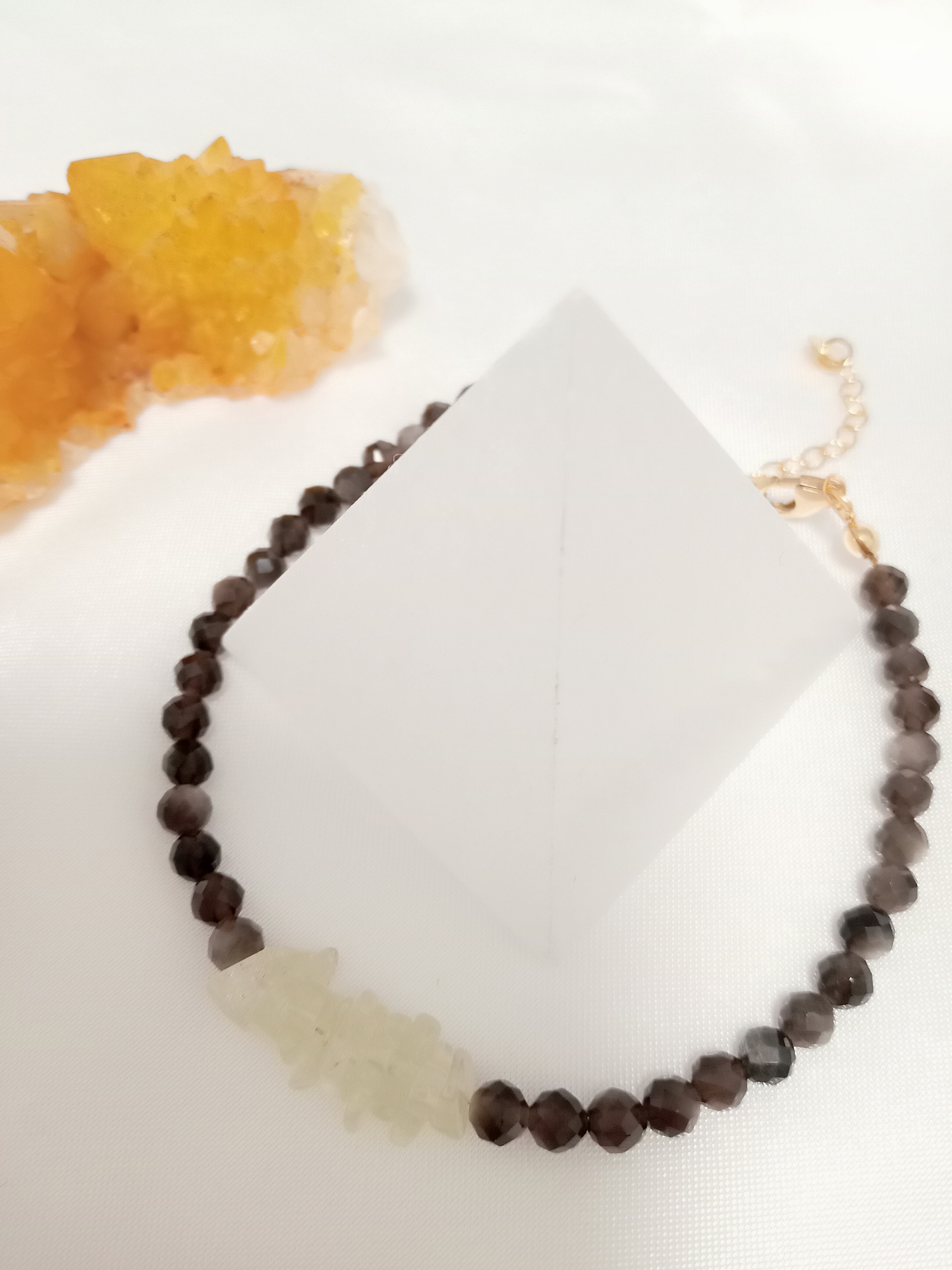 天然石のため太陽光や汗などで変色することがあります。また、衝突により欠けることがあります。特にリビアングラスはガラス成分で薄いパーツのためご注意ください。